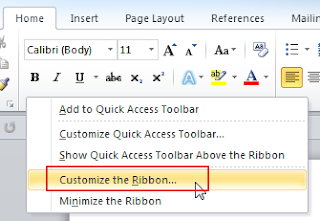 இதை மிகவும் எளிதாக்க ஆபீஸ் 2010 பதிப்பில் Customize the Ribbon எனும் புதிய வசதி மிகவும் பயனுள்ளதாக அமைந்துள்ளது. இதனை மைக்ரோசாப்ட் வோர்ட் இல் எப்படி பயன்படுத்துவது என்பதை பார்க்கலாம்.